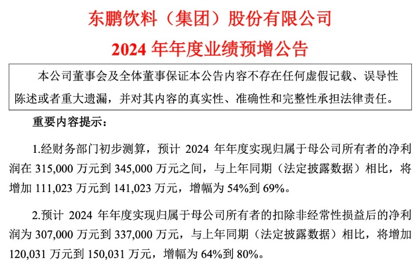 饮料巨头业绩新高!东鹏饮料:预计去年净利润超30亿元