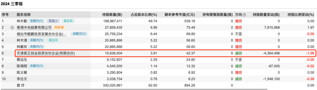 从2022年至今,君正投资已多次减持公司股份,从公司第二大股东降为第六大股东,2024年三季度末的持股比例已低于5%。